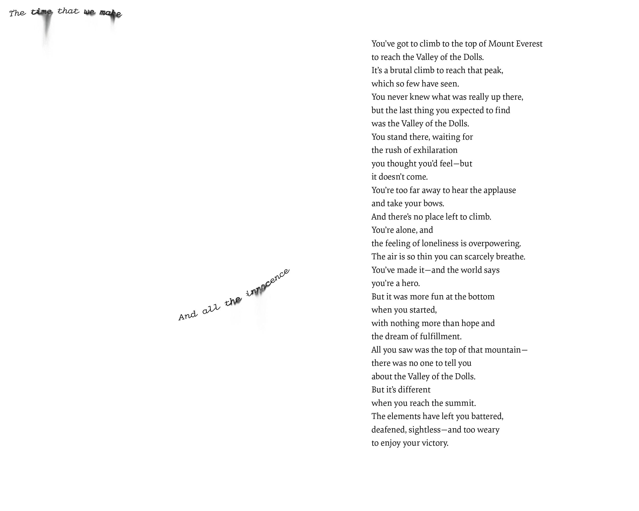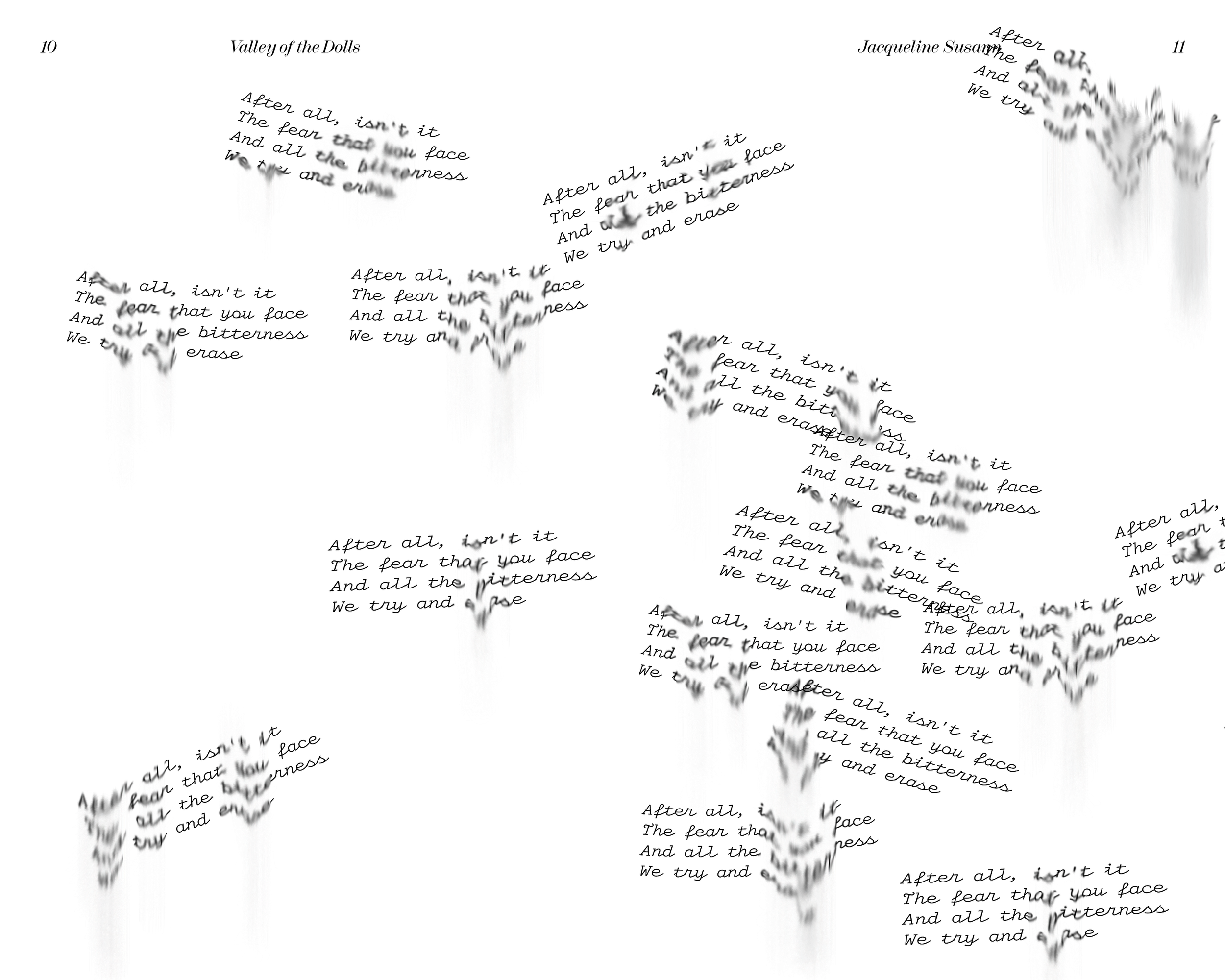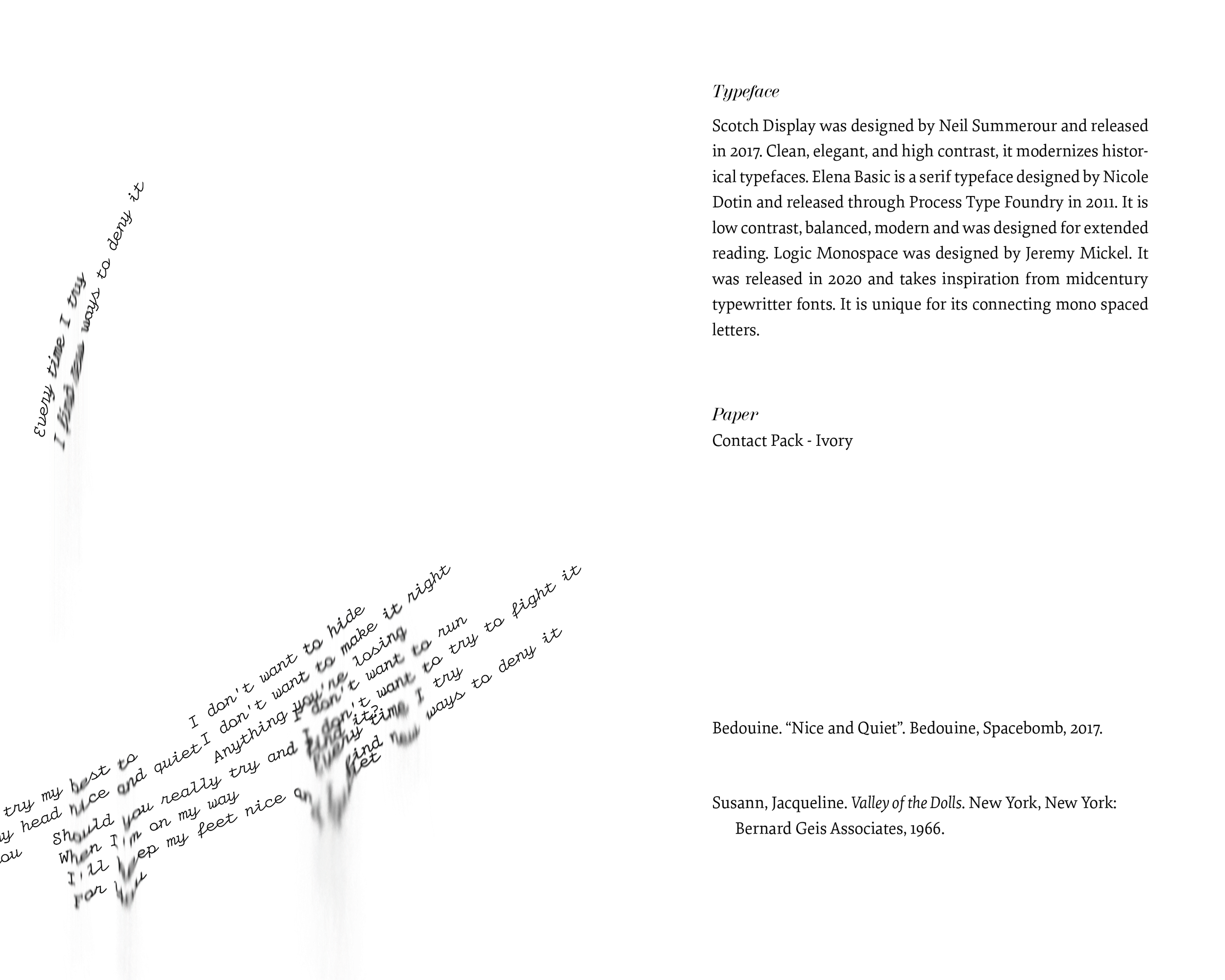 For this chapbook project I use text from one of my favorite novels “Valley of the Dolls” by Jaqueline Susann and the song “Nice and Quite” by Bedouine. I got comfortable with all of the detailed work required for setting long form type and weaved expressive type throughout the text. The expressive type builds as you go through the booklet, and is meant to represent tears falling on handwritten notes.