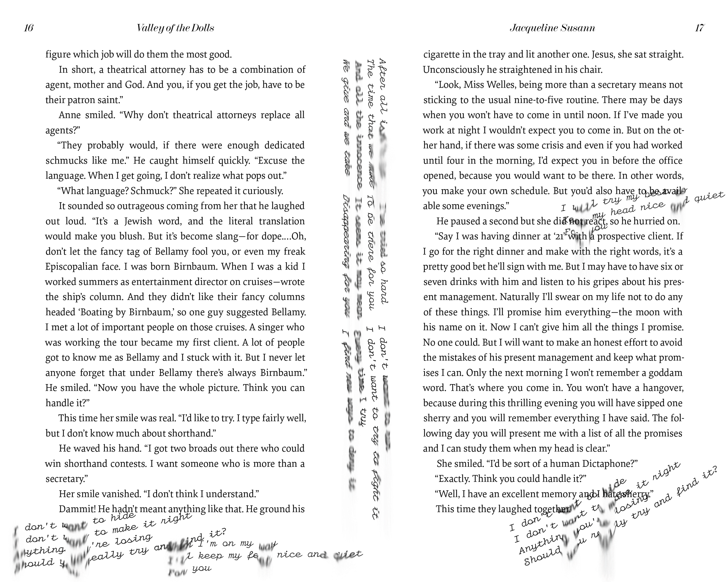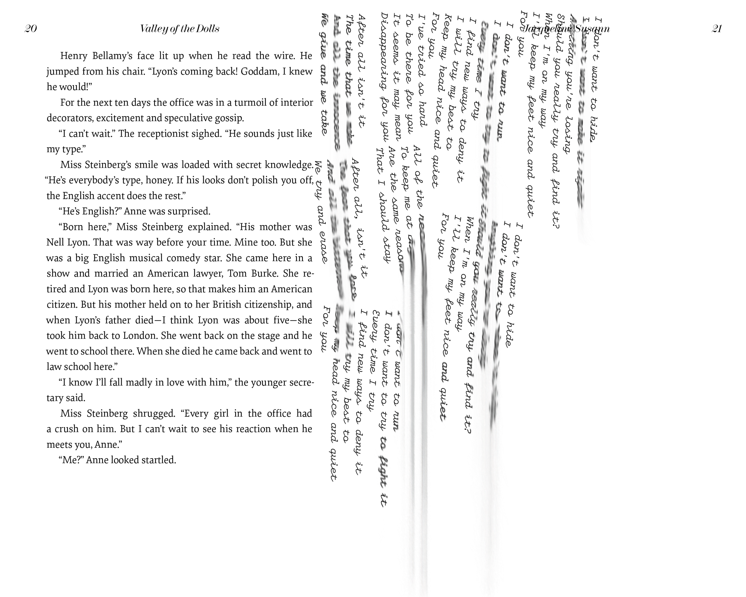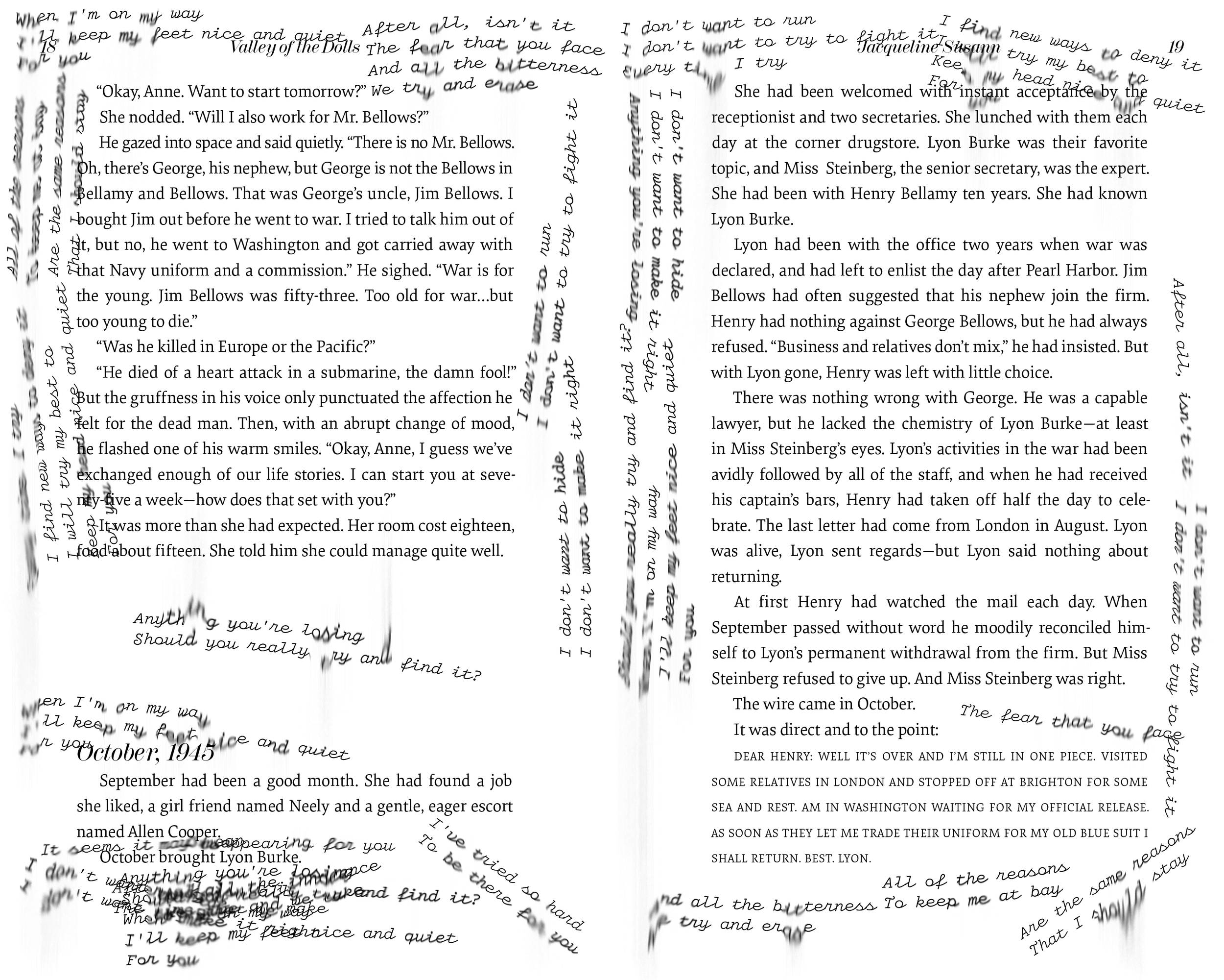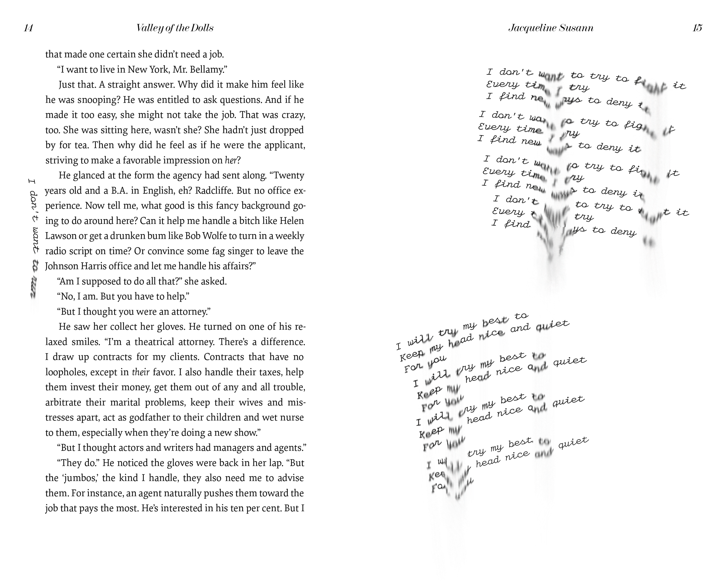 For this chapbook project I use text from one of my favorite novels “Valley of the Dolls” by Jaqueline Susann and the song “Nice and Quite” by Bedouine. I got comfortable with all of the detailed work required for setting long form type and weaved expressive type throughout the text. The expressive type builds as you go through the booklet, and is meant to represent tears falling on handwritten notes.